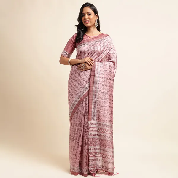 Coral pink tussar silk printed banarasi saree with blouse piece attached