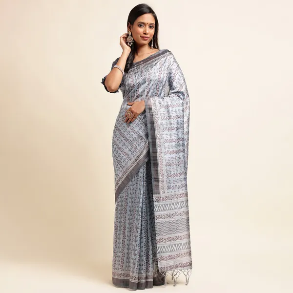 Ocean blue tussar silk printed banarasi saree with blouse piece attached