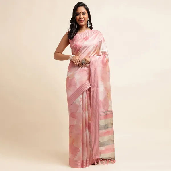 Pretty pink katki silk printed banarasi saree with blouse piece attached