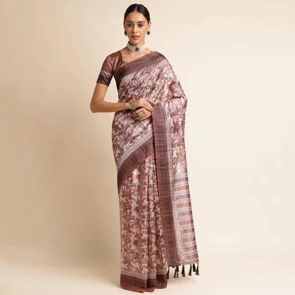 Rich brown bonga silk printed banarasi saree with blouse piece attached